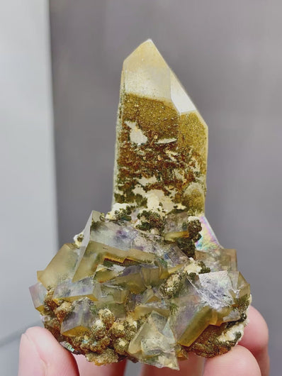 Structure: Cubic rainbow fluorite × Terminated quartz obelisk